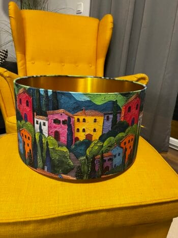 • Sva naša sjenila izrađena su od visokokvalitetnih materijala, najčešće u kombinaciji lana i pamuka, koji pružaju prirodan izgled i odličan su izbor za dizajnerska sjenila, jer spajaju estetiku, funkcionalnost i održivost. Tkanina je tkana u 2×1 Oxford vezu što joj daje teksturu. Upravo zbog tog načina tkanja, sjenilo ima karakter koji se lijepo ističe kada je svjetlo upaljeno.Tisak na tkanini izrađuje se digitalno u SAD-u s ekološki prihvatljivim bojama na bazi vode. Ova tehnika omogućuje izuzetnu preciznost i postojanost, a uz to rezultira lijepim, intenzivnim bojama koje oživljavaju svaki uzorak i daju sjenilu poseban vizualni dojam